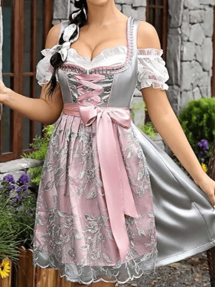 Deze dirndljurk kan worden gestyled met traditionele accessoires, zoals een bloemenhoofdband, of gecombineerd met elegante hakken om uw feestelijke look te versterken.
